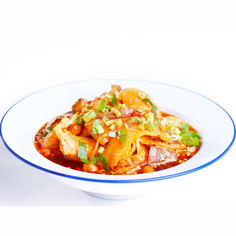 四川名菜,通常以牛头皮、牛心、牛舌、牛肚、牛肉为主料,配以辣椒油、花椒面等辅料,调拌而成。色泽红亮,质地软嫩,口味麻辣浓香。观之青红碧绿,红油重彩,颜色透亮;入口软糯爽滑,脆筋柔糜、细嫩化渣。