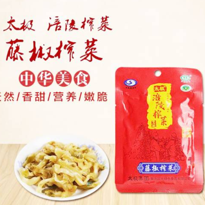 太极涪陵藤椒榨菜,采用传统技艺与现代工艺完美融合,藤椒香味突出,麻香四溢、老少皆宜,更受年轻人追捧,极具网红爆款潜质!