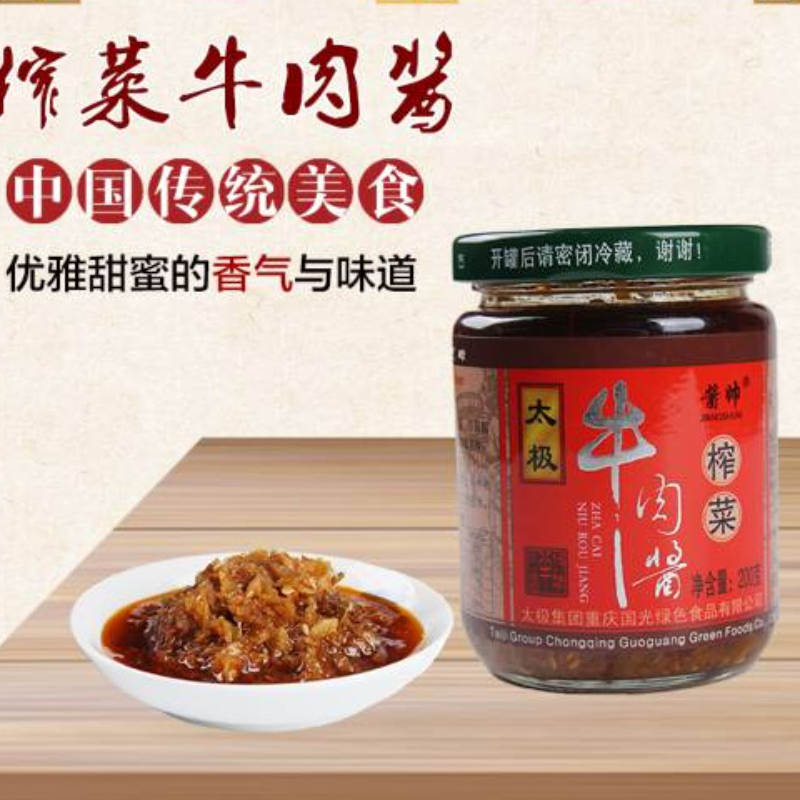 太极榨菜牛肉酱、采用现代工艺和地方特色完美融合,既保留了榨菜的鲜香味美、又有牛肉香醇质嫩,二种美食完美融合又**出新的味道,乃人间拌饭、做面、炒菜、炖鱼等之佳品,与馒头是绝配,深受广大消费者的喜爱。
