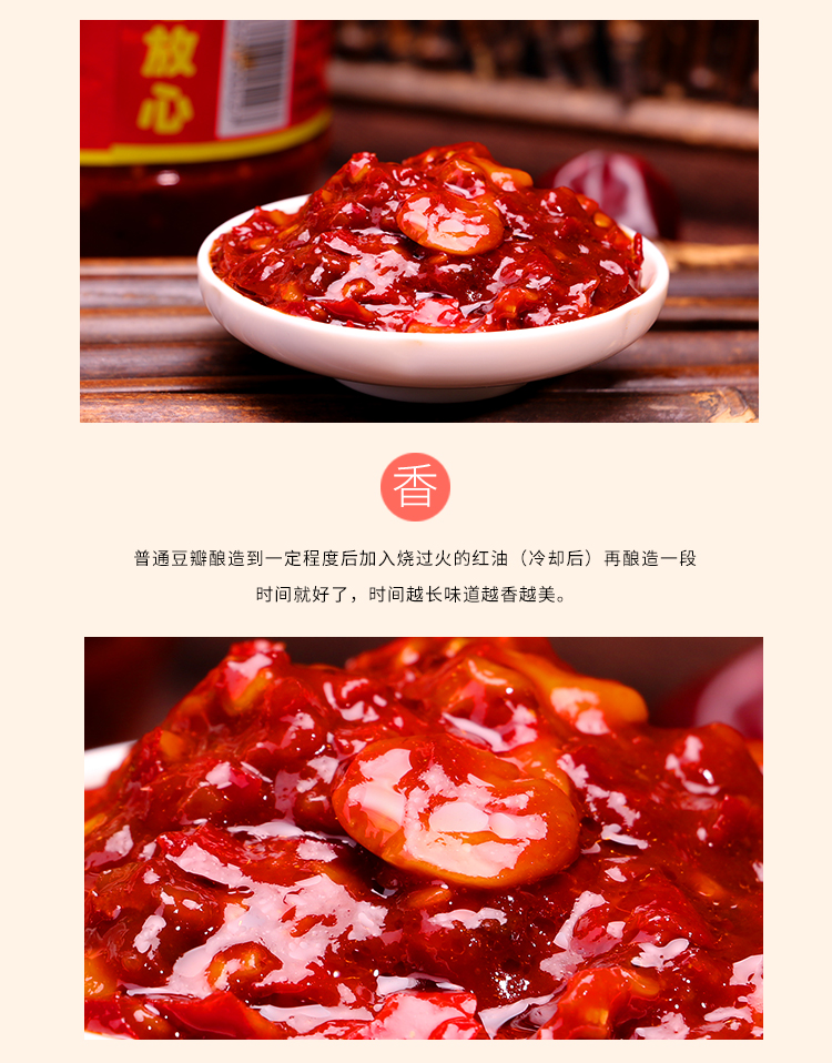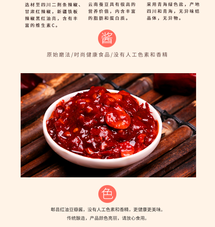 红油郫县豆瓣,成都市郫都区(旧称郫县)特产,中国地理标志产品。是中国知名调味料之一。它在选材与工艺上独树一帜,与众不同。香味醇厚却未加一点香料,色泽油润却未加任何油脂,全靠精细的加工技术和原料的优良而达到色、香、味俱佳的标准,具有辣味重、鲜红油润、辣椒块大、回味香甜的特点,是川味食谱中常用的调味佳品,有"川菜之魂"之称。其制作技艺列第二批国家级非物质文化遗产名录。