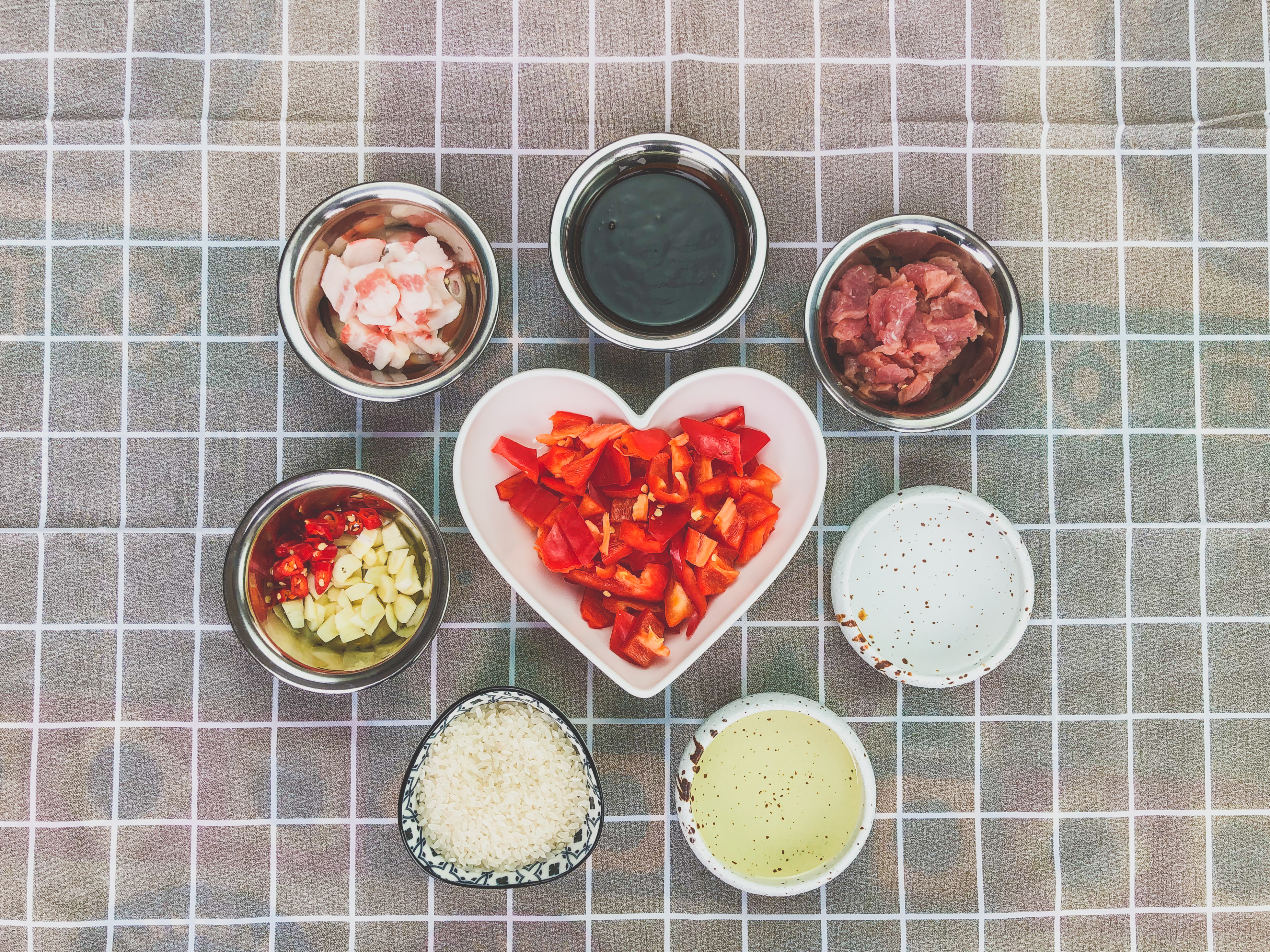 熟米饭300g,猪瘦肉40g ,猪五花肉20g,红辣椒60g,大蒜6g,