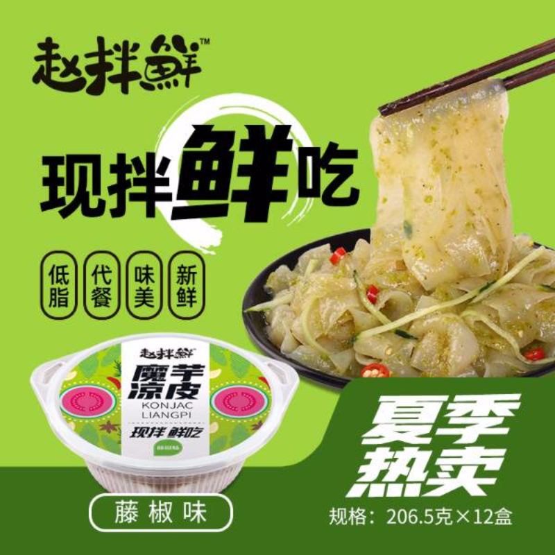 “赵拌鲜”魔芋凉皮采用新鲜魔芋,经打粉、制皮等工艺精制而成,配置料包:红油味、藤椒味、芥末味、麻酱味等。