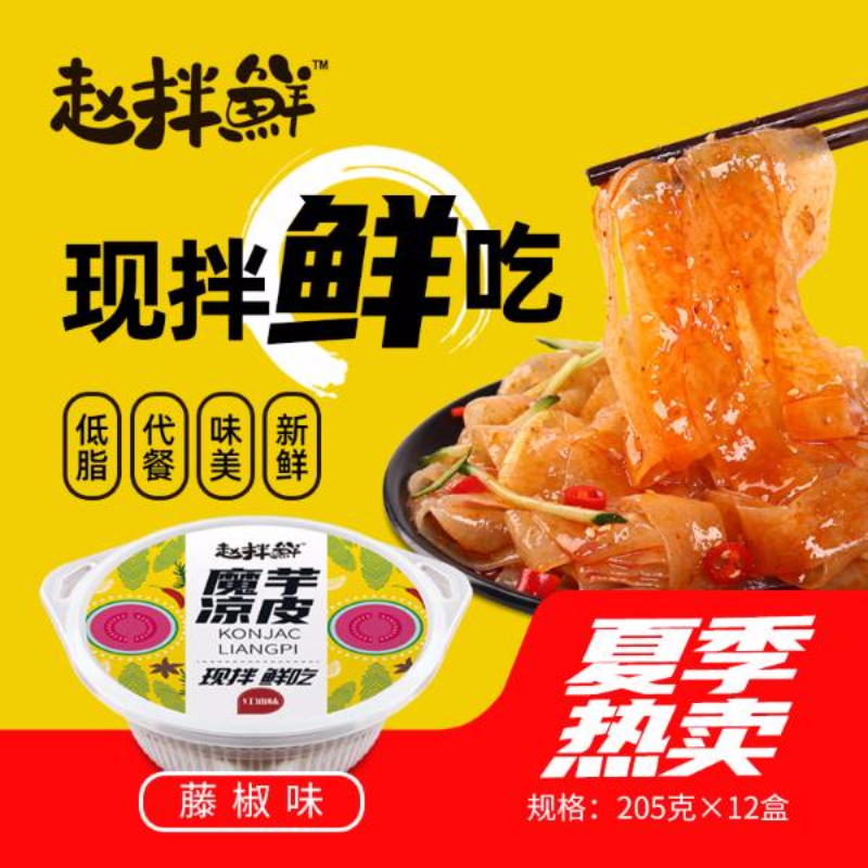 “赵拌鲜”魔芋凉皮,采用新鲜魔芋,经打粉、制皮等工艺,纯魔芋粉制成。酱包配置红油味、藤椒味、麻酱味、芥末味等