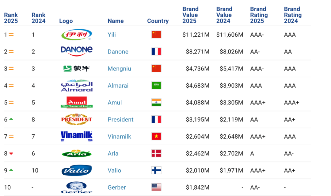 在“全球乳业品牌价值十强”榜(Top 10 Most Valuable Dairy Brands 2025)上,伊利、达能、蒙牛名列前三位。