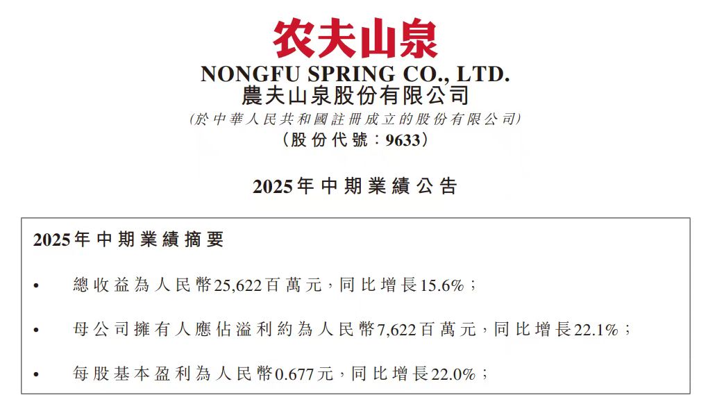 农夫山泉公告,2025年中期总收益为256.22亿元,同比增长15.6%;母公司拥有人应占溢利约为76.22亿元,同比增长22.1%;每股基本盈利为0.677元,同比增长22.0%。