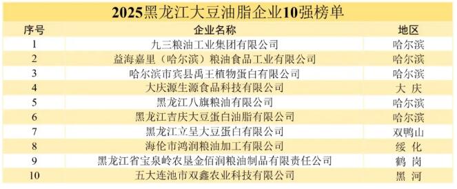 近期,黑龙江省企业联合会、省企业家协会等多机构联合发布“2025黑龙江大豆油脂企业10强榜单”。十强企业营业收入达334.52亿元,筑牢黑龙江省非转基因产业高地,亦勾勒出该省大豆油脂产业的 “硬核实力版图”。
