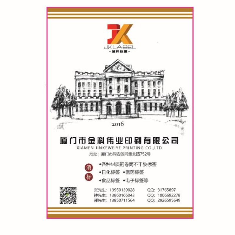 厦门市金科伟业印刷有限公司专业从事不干胶标签印刷。