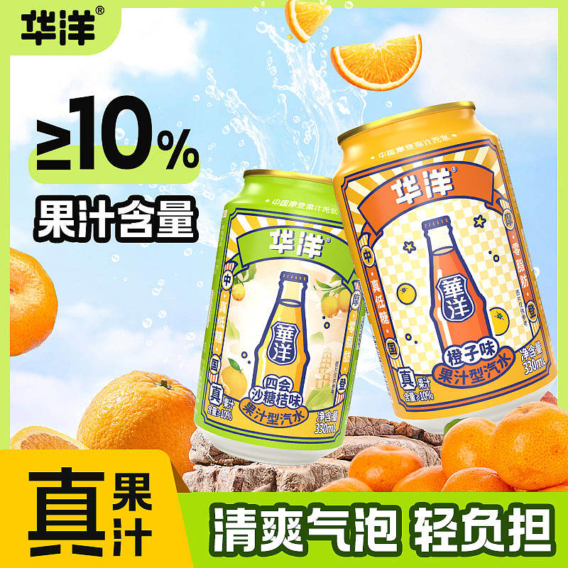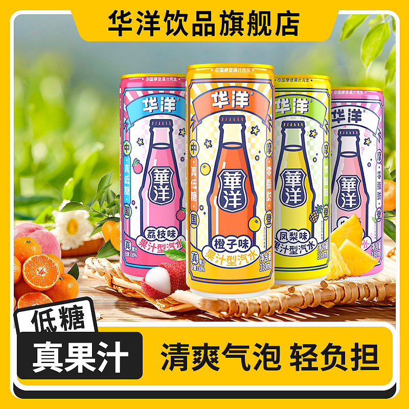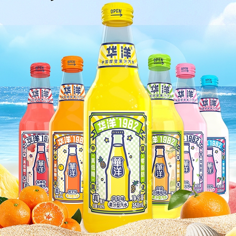 华洋果汁汽水曾风靡广东等南方地区,成为一代人的经典味道记忆,2021年广州华洋饮品有限公司重磅新品华洋1982汽水 ,凭借广东“水果之乡”的资源优势,结合多年前华洋汽水厂独创的添加真果汁的工艺和配方,推出“果香味浓,气足爽口”的多款独特的果汁汽水,采用国潮设计包装,炫彩突出,推出橙子、沙糖桔、荔枝、凤梨、樱花、山楂等6种口味选择,兼具了“经典传统”与“网红潮流”,满足了不同消费人群的口味需求,10%果汁含量,真低糖,零脂肪,开辟出汽水赛道的新玩法,玻璃瓶和易拉罐、大瓶分享装,500ml塑料 pet瓶等多种品项,适应多重消费场景引爆,打造老广州风味汽水经典,成为2021-2024年饮品市场的渠道商机热品和标杆成长品牌!